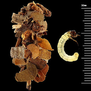 植物片で不定形の可携巣を作る中型のトビケラです。不定形の可携巣だけで十分な同定形質となりえますが、図鑑的には、胸部背面は前胸・中胸が広くキチン化し、後胸側面に小さなキチン板が一対だけあることで他科と識別されます。